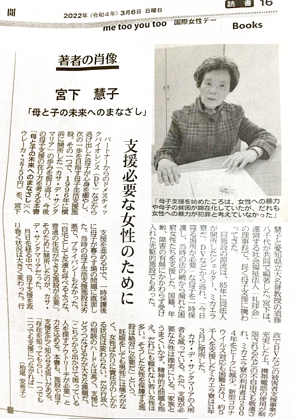 国際女性デーにちなみ、宮下慧子理事長が2022年3月6日の神奈川新聞の『著者の肖像』で取り上げられました。母子生活支援施設の入所者が軽減している現実がある一方で地域ではDVや虐待件数が増加しており、必要な母子に必要な情報や支援が届くようアウトリーチや情報発信の必要性を訴えました。